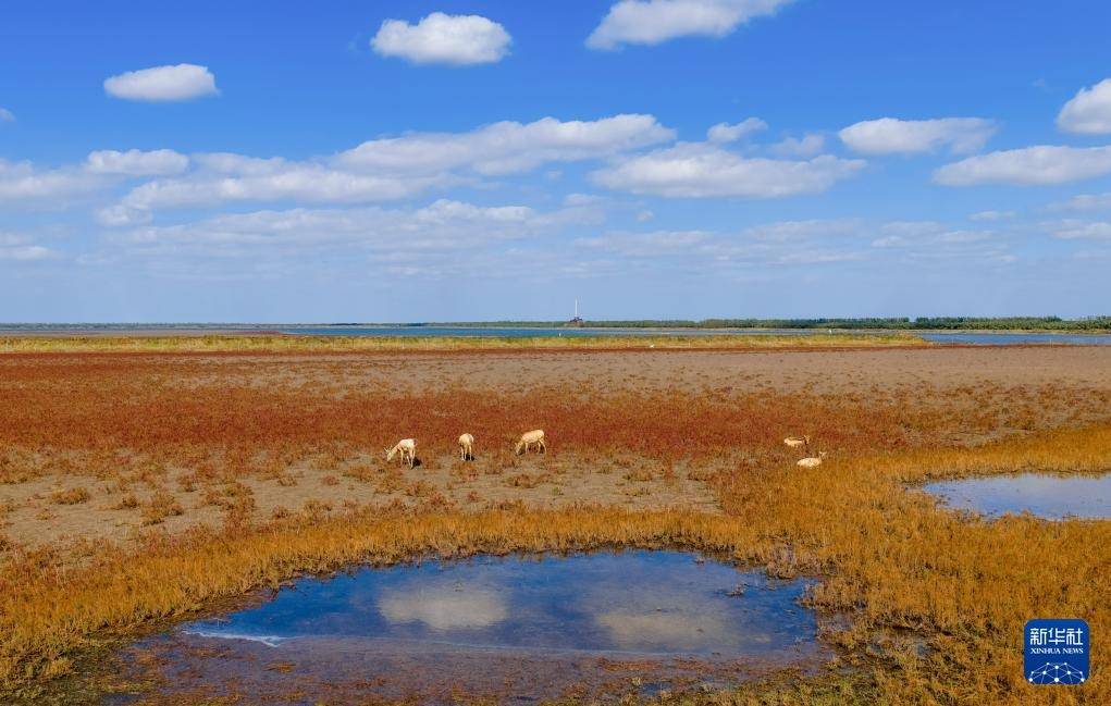 11月10日,麋鹿在江苏东台条子泥湿地栖息(无人机照片)。